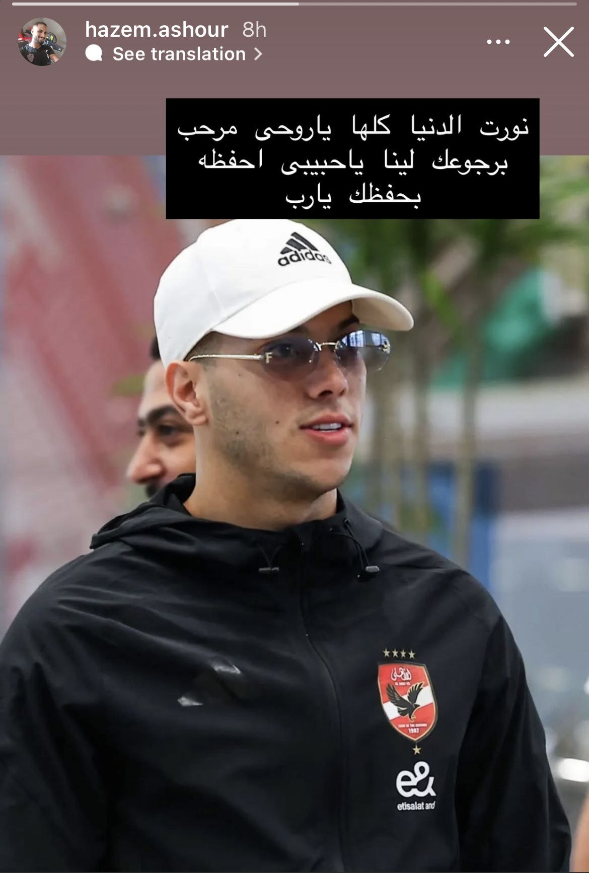 وجه حازم عاشور رسالة دعم لشقيقه أمام بعد سفرة مع الفريق إلى الإمارات العربية المتحدة ظهر اليوم، استعدادا للمشاركة في بطولة السوبر المصري.