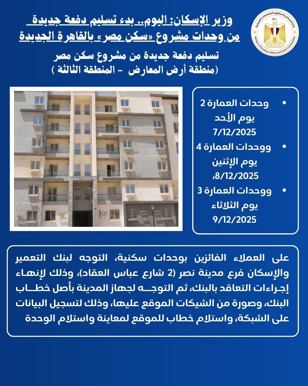 وأوضح المهندس أحمد رشاد، رئيس جهاز تنمية مدينة القاهرة الجديدة، أنه سيتم تسليم دفعة جديدة من مشروع سكن مصر (منطقة أرض المعارض - المنطقة الثالثة )، حيث سيتم تسليم وحدات العمارة 19، يوم الثلاثاء 4/11/2025، ووحدات العمارة رقم 18، يوم الخميس 6/11/2025، ووحدات العمارة 13، يوم الأحد 9/11/2025، ووحدات العمارة 16، يوم الثلاثاء 11/11/2025، ووحدات العمارة 15، يوم الخميس 13/11/2025، ووحدات العمارة 17 يوم الأحد 16/11/2025، ووحدات العمارة 10، يوم الثلاثاء 18/11/2025، ووحدات العمارة 14، يوم الخميس 20/11/2025.