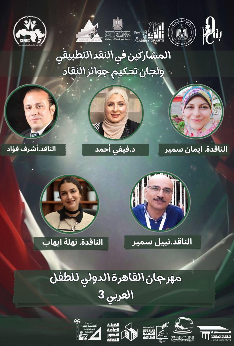 أعلن مهرجان القاهرة الدولي للطفل العربي في دورته الثالثة، برئاسة الدكتورة داليا همام، عن أسماء أعضاء لجان تحكيم جوائز النقاد والمشاركين في ورش النقد التطبيقي، والتي تضم نخبة من أبرز النقاد والمخرجين والأكاديميين المتخصصين في المسرح.