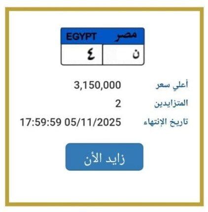 أعلنت بوابة مرور مصر الإلكترونية، المزايدة على لوحة معدنية مميزة للسيارات، وصل سعرها إلى 3 مليون و150 ألف جنيه، وتحمل رقم «ن 4»، ويتزايد عليها حتى الآن شخصين، ومن المقرر أن تنتهي المزايدة عليها غدا الأربعاء الموافق 5 نوفمبر 2025.