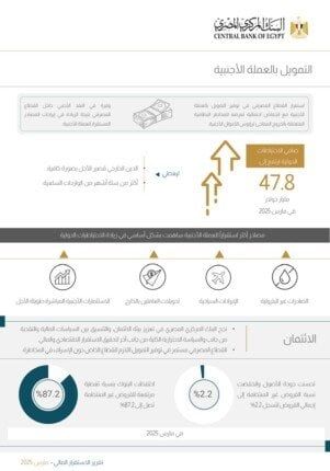 وسلط التقرير الضوء على استمرار القطاع المصرفي في توفير التمويل بالعملة الأجنبية، مع انخفاض احتمالية تعرضه للمخاطر النظامية المتعلقة بالخروج المفاجئ لرؤوس الأموال الأجنبية. ويأتي ذلك في ضوء وفرة النقد الأجنبي داخل القطاع المصرفي، نتيجة ارتفاع الصادرات غير البترولية، والإيرادات السياحية، وتحويلات العاملين بالخارج، والاستثمارات الأجنبية المباشرة طويلة الاجل، مما انعكس في التحسن في صافي الاحتياطيات الدولية بالعملة الأجنبية ليصل إلى 47.8 مليار دولار في مارس 2025، ليستمر في تغطية الدين الخارجي قصير الأجل بصورة كافية وأكثر من ستة أشهر من الواردات السلعية.