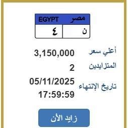 طرحت بوابة مرور مصر الإلكترونية، لوحة معدنية مميزة تحمل رقم (ن - 4 )، يتم التزايد عليها ووصل سعرها 3 ملايين و150 ألف جنيه، ويزايد عليها شخصين، وتنتهي المزايدة عليها غدا الأربعاء 5نوفمبر 2025.