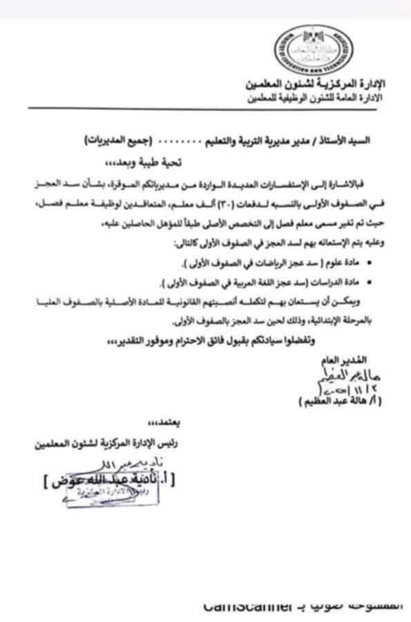 أكدت وزارة التربية والتعليم والتعليم الفني، أنه بالإشارة إلى الاستفسارات العديدة الواردة من المديريات، بشأن سد العجز في الصفوف الأولى بالنسبة لدفعات مسابقة 30 ألف معلم المتعاقدين لوظيفة معلم فصل، تم تغيير مسمى معلم فصل إلى التخصص الأصلى طبقاً للمؤهل الحاصلين عليه وعليه وسيتم الاستعانة بهم لسد العجز في الصفوف الأولى كالتالى: