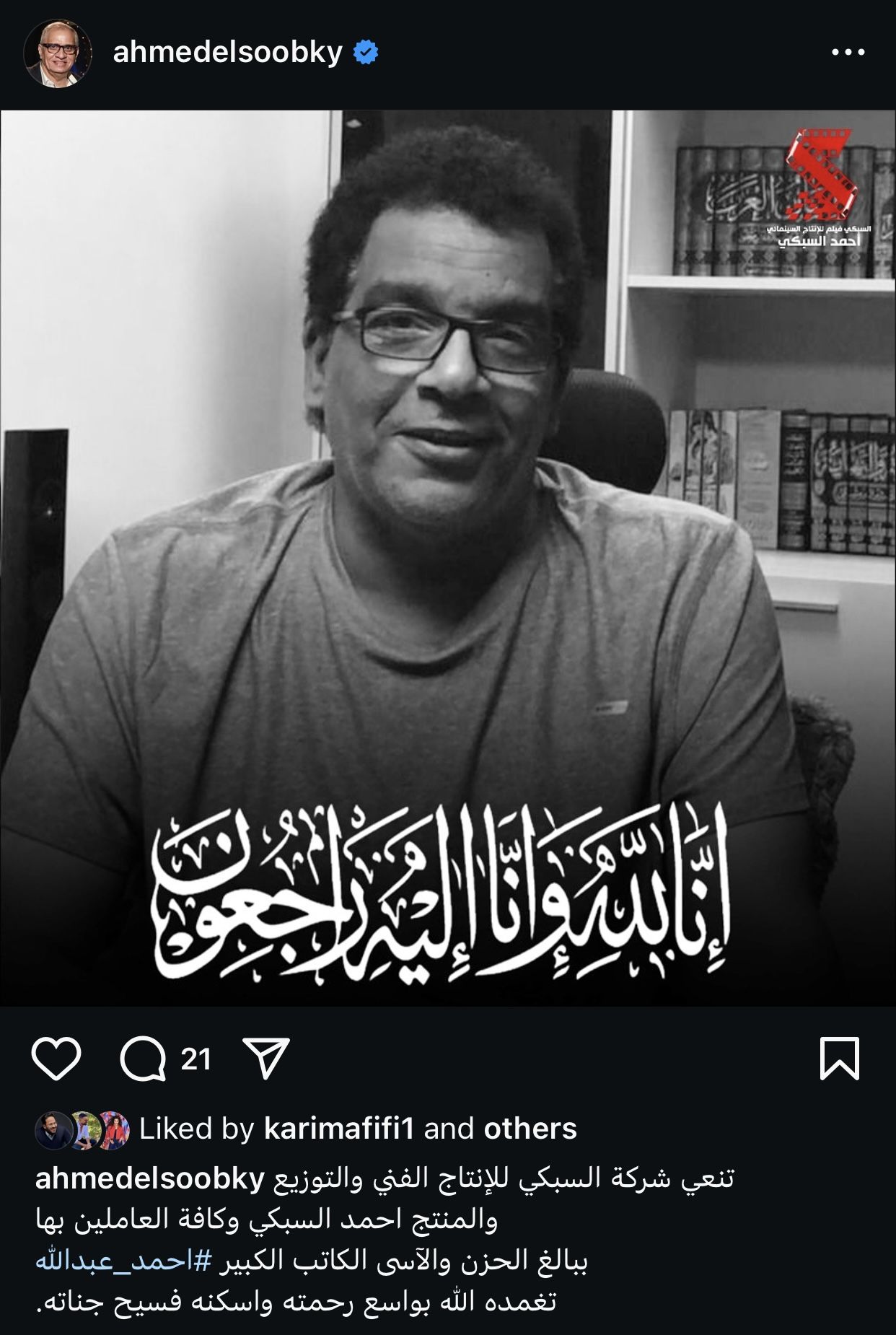 نعت شركة السبكي للإنتاج الفني والتوزيع، والمنتج أحمد السبكي، الكاتب الكبير أحمد عبدالله، الذي وافته المنية منذ قليل.