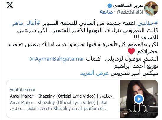 وشارك عزيز الشافعي، عبر حسابه الرسمي بموقع تبادل التغريدات «إكس» البرومو الدعائي لأغنية «خذلني» لـ أمال ماهر، معلقا عليها قائلا: «“خذلني” أغنية جديدة من ألحاني للنجمة السوبر آمال ماهر، كانت المفروض تنزل فألبومها الأخير المتميز، لكن منزلتش للأسف، لكن عالعموم كل تأخيرة وفيها خيرة، وإن شاء الله بتمنى تعجب حضراتكم، الشكر موصول لزمايلي. كلمات توزيع أحمد إبراهيم ميكس أمير محروس».