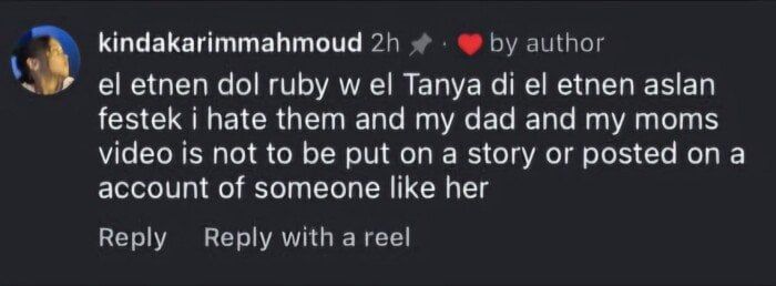 وأعادت كندة، ابنة كريم محمود عبد العزيز، نشر أحد المنشورات التي تزعم بوجود علاقة تجمع والدها بالفنانة دينا الشربيني، عبر حسابها بموقع «إنستجرام، وعلقت: الإثنين دول روبي والتانية أنا بكرههم»، مشيرة إلى أنه لا يصح تداول مثل هذه الشائعات عن والدها.
