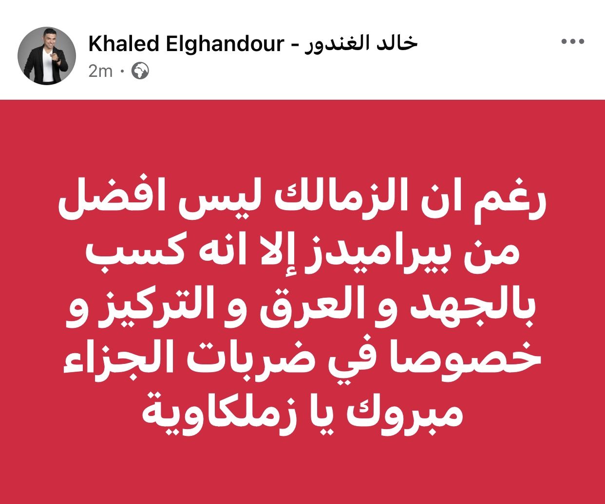 وكتب الغندور عبر حسابه الشخصي بموقع فيسبوك: "رغم ان الزمالك ليس أفضل من بيراميدز إلا أنه كسب بالجهد والعرق و التركيز و خصوصا في ضربات الجزاء، مبروك يا زملكاوية".