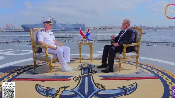 وقال قائد قوات البحرية المصرية، في لقائه على قناة "دي ام سي"، إننا الآن في الميناء الغربي في قاعدة الإسكندرية البحرية، ومن خلفنا تظهر الميسترال وعدد من الفرقاطات، وبعض الوحدات التي تقوم بتامين المسطح المائي للميناء.