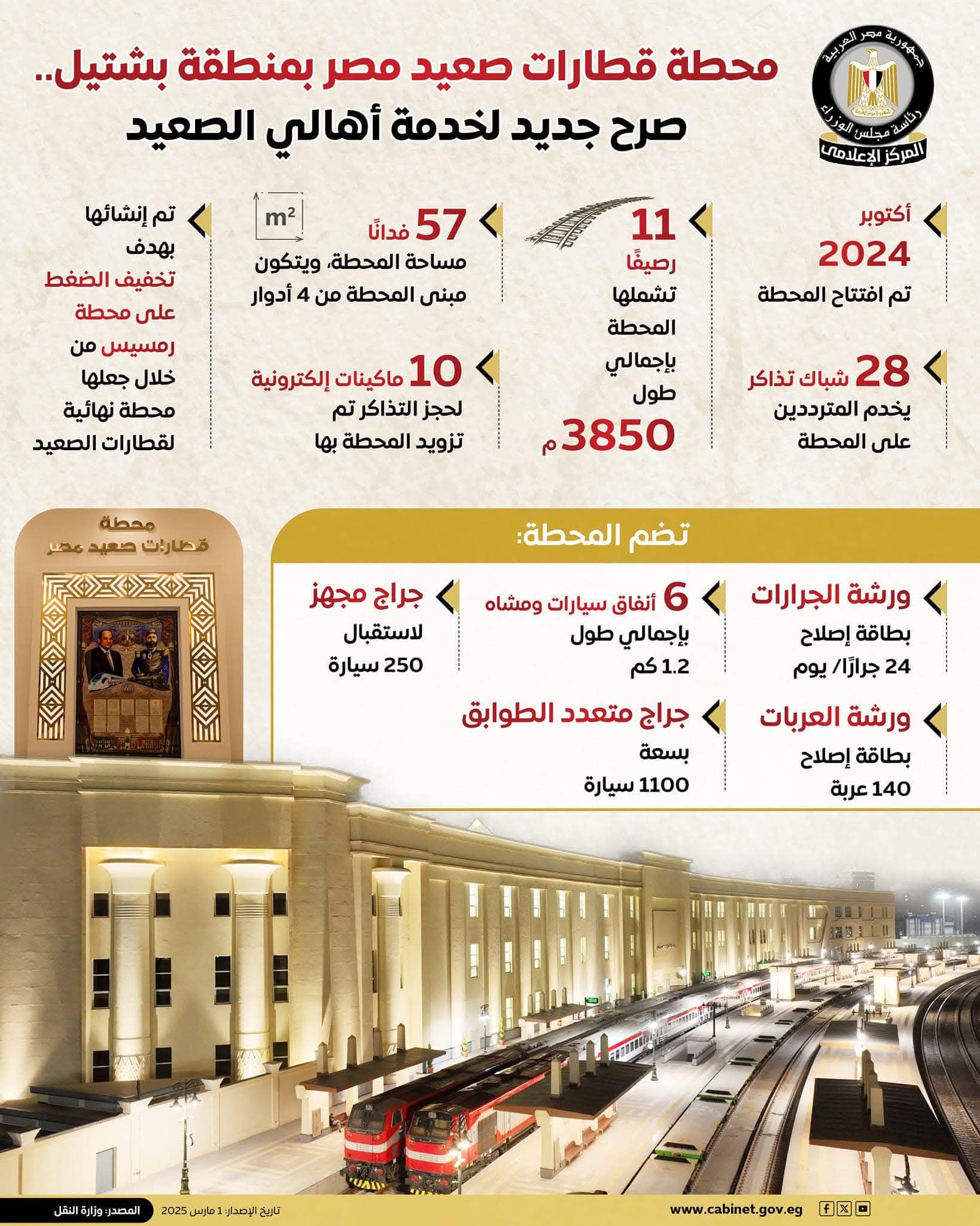 نشرت وزارة النقل إنفوغرافًا أوضحت فيه تفاصيل محطة قطارات صعيد مصر بمنطقة بشتيل بمحافظة الجيزة، التي تم افتتاحها في أكتوبر 2024، باعتبارها أحد أبرز المشروعات الحديثة لخدمة أهالي الصعيد، وتخفيف الضغط عن محطة مصر برمسيس، من خلال إنشاء محطة مركزية متكاملة تربط شبكات النقل المختلفة وتوفر أعلى مستويات الخدمة للركاب.