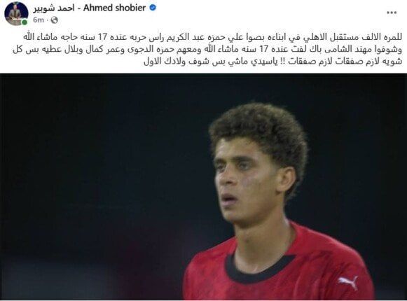 وقال شوبير عبر حسابه الرسمي فيس بوك:«للمرة الألف، مستقبل الأهلي في أبناءه، ركزوا على حمزة عبد الكريم لاعب شباب الأهلي ومنتخب مصر تحت 17 سنة».