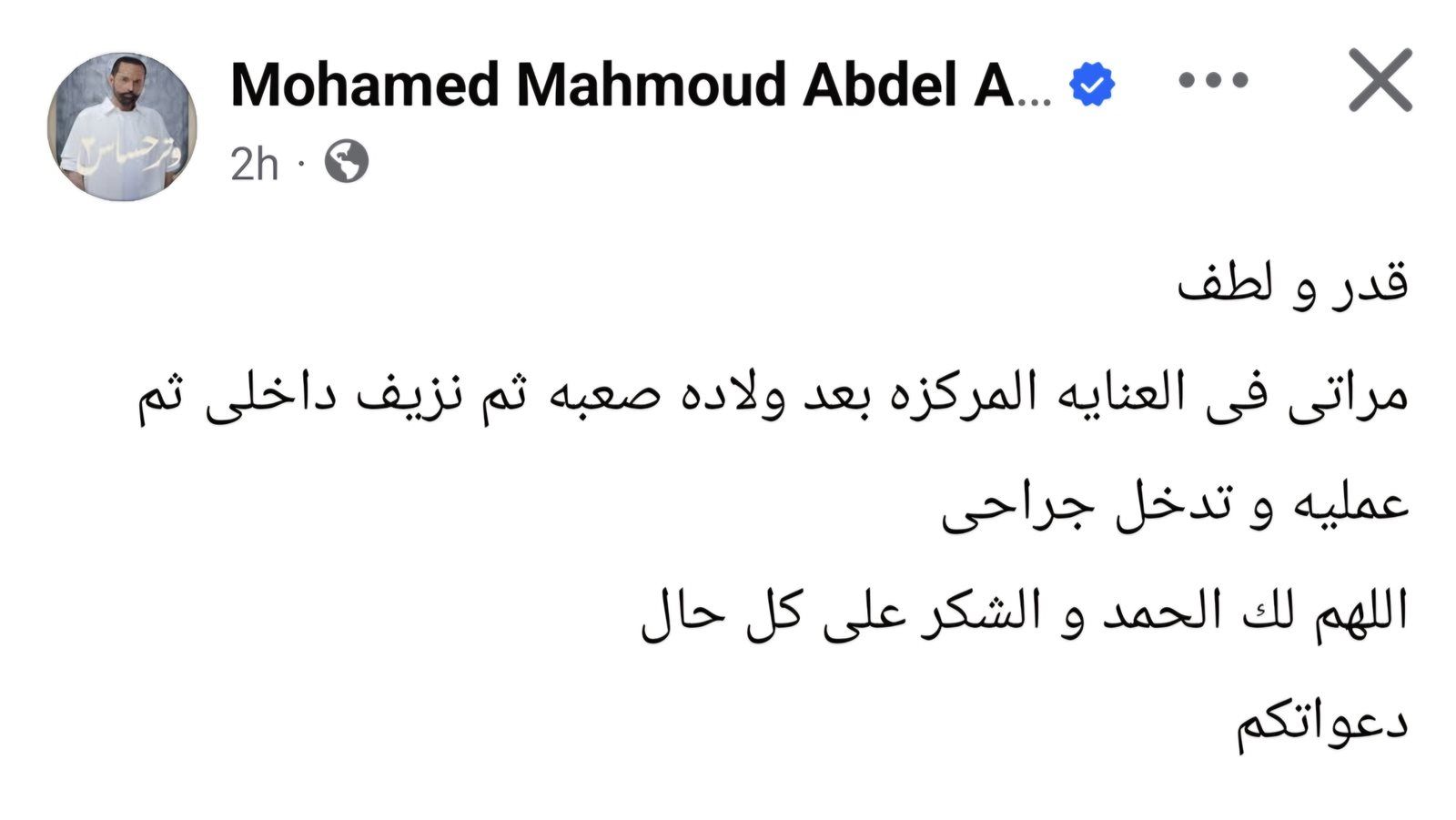 طلب الفنان محمد محمود عبد العزيز من جمهوره الدعاء لزوجته التي دخلت العناية المركزة بعد تعرضها لنزيف عقب عملية الولادة.