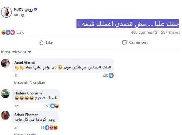 وكتبت روبي عبر حسابها بموقع التواصل الاجتماعي «فيسبوك»: «حقك عليا.. مش قصدي أعملك قيمة»، وتعد الجملة جزءًا من كلمات الأغنية الجديدة «حقك عليا» ولكن الجمهور اعتبرها ردا غير مباشر من روبي على اتهامها بالتسبب في تدمير الحياة الزوجية للفنان كريم محمود عبد العزيز.