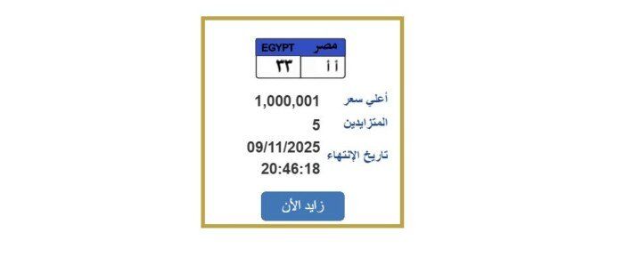 أعلنت بوابة مرور مصر الإلكترونية، المزايدة على لوحة معدنية مميزة للسيارات، وصل سعرها إلى مليون جنيه، وتحمل رقم «أ أ 33»، ويتزايد عليها حتى الآن 5 أشخاص، ومن المقرر أن تنتهي المزايدة عليها اليوم الأحد الموافق 9 نوفمبر 2025.