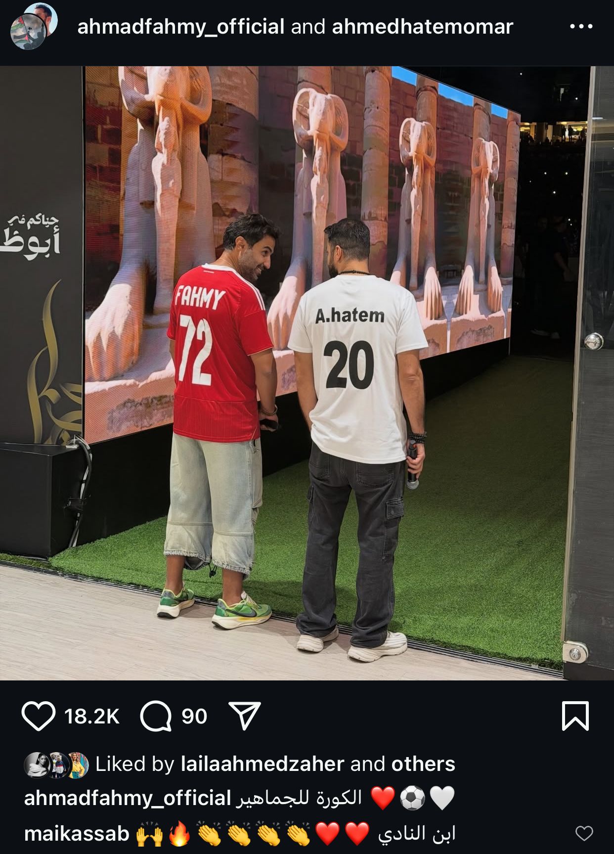 نشر الفنان أحمد فهمي صورته مع الفنان أحمد حاتم من مباراة نهائي كأس السوبر المصري، عبر حسابه الشخصي بموقع إنستجرام وعلق عليها قائلاً: “الكرة للجماهير”.