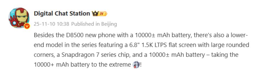 أفادت تقارير أن شركة هونر تعمل على هاتفين، ليس هاتفًا واحدًا، ببطارية ضخمة بسعة 10,000 مللي أمبير/ ساعة الهاتف الأول هو هونر باور 2 المزود بمعالج Dimensity 8500 ، والمتوقع إصداره في الربع الأول من عام 2026. واليوم، نشر موقع Digital Chat Station، وهو موقع موثوق، منشورًا على Weibo يكشف تفاصيل الهاتف الآخر المزود ببطارية بسعة 10,000 مللي أمبير/ ساعة.