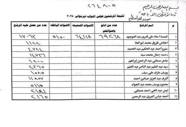 ويظهر الجدول التالي الحصر العددي لمرشحي دائرة ديرمواس خلال الجولة الأولى بانتخات مجلس النواب وجاء الترتيب كالتالي: