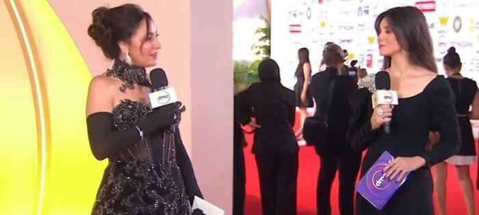 وأطلت نرمين الفقي مرتدية فستان طويل شفاف باللون الأسود، ومزين بتطريزات لامعة بالكامل، ونسقت مع الفستان قفازات طويلة بنفس لون الفستان.