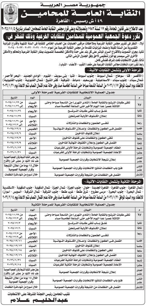 أعلنت النقابة العامة للمحامين، برئاسة النقيب عبد الحليم علام، عن دعوة الجمعية العمومية للمحامين للاجتماع بالنقابات الفرعية للنظر في عدد من الملفات المالية والإدارية المهمة، وذلك في إطار تطبيق أحكام قانون المحاماة رقم 17 لسنة 1983 وتعديلاته، وبناءً على قرار مجلس النقابة الصادر بتاريخ 5 نوفمبر 2025.