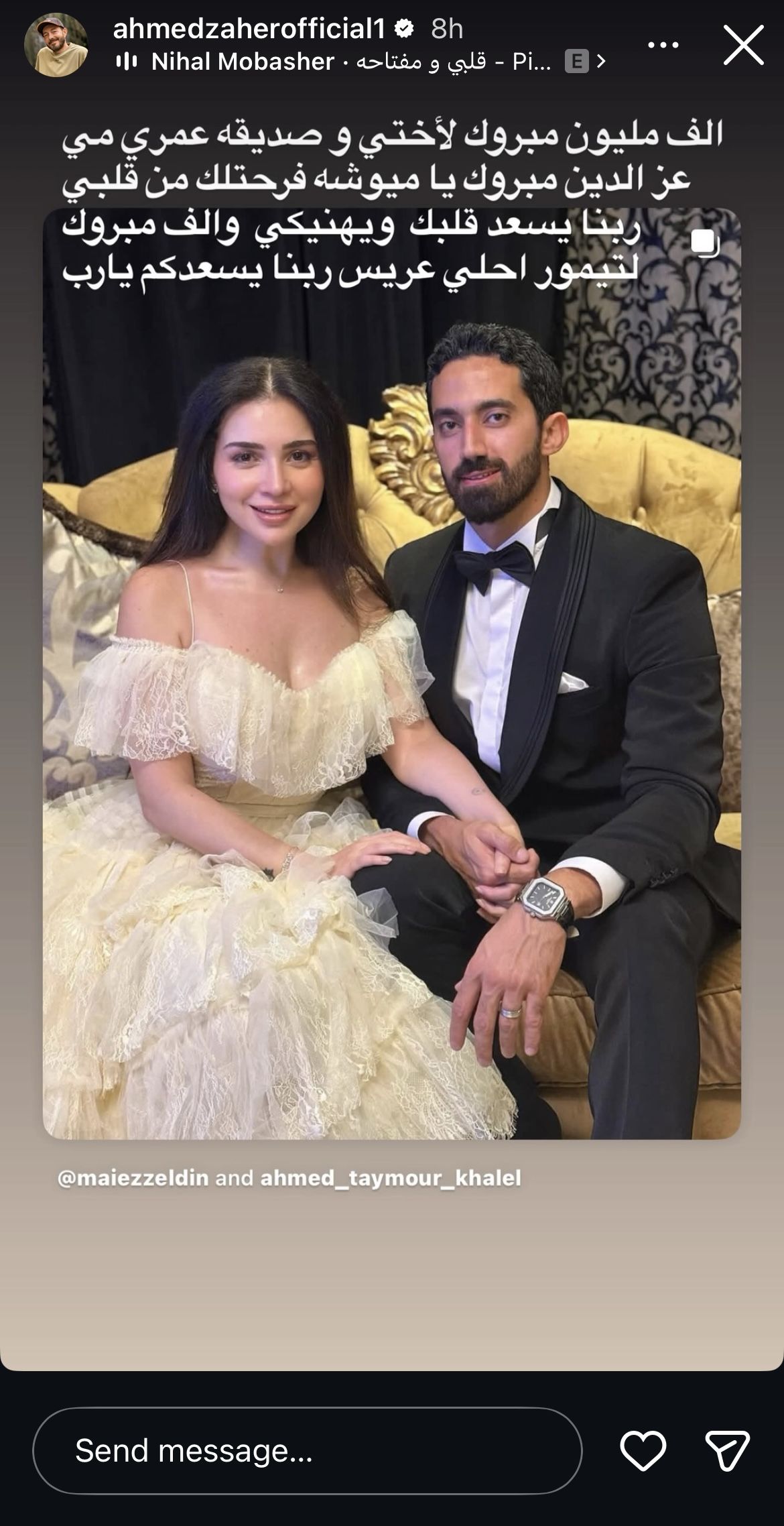 وكتب زاهر عبر ستوري حسابها على انستجرام: “ألف مبروك لأختي وصديقة عمري مي مبروك يا ميوشة فرحتلك من قلبي ربنا يسعد قلبك ويهنيكي والف مبروك لتيمور أحلى عريس”.