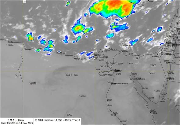 كشفت هيئة الأرصاد الجوية عن أنه تشير آخر صور الأقمار الصناعية إلى استمرار تدفق السحب الرعدية الممطرة على مناطق من السواحل الشمالية الغربية (الإسكندرية - مطروح)، يصاحبها سقوط أمطار متوسطة قد تكون غزيرة أحياناً على بعض المناطق، وقد تكون مصحوبة بتساقط لحبات البرد على بعض المناطق.