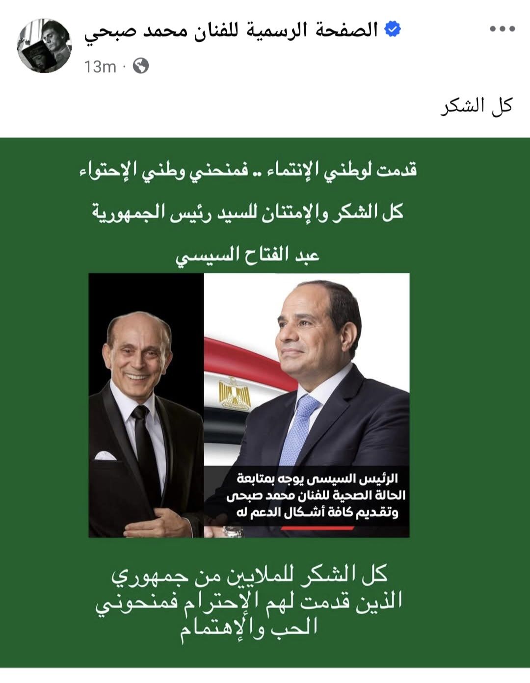 عبر الفنان محمد صبحي عن شكره وامتنانه لاهتمام الرئيس عبد الفتاح السيسي بمتابعة حالته الصحية، كما وجه الشكر أيضا لجمهوره الذي منحه الحب والاهتمام بعد الوعكة الصحية التي ألمت به مؤخرا.