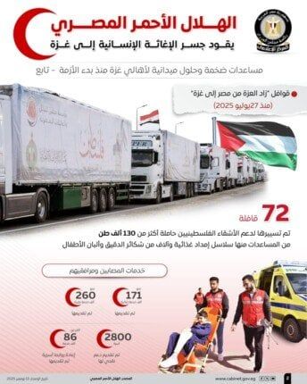 وفي سياق متصل، أطلق الهلال الأحمر قوافل «زاد العزة من مصر لغزة» منذ 27 يوليو 2025، حيث تم تسيير 72 قافلة لدعم الأشقاء الفلسطينيين، بحمولات تجاوزت 130 ألف طن من المساعدات، تشمل سلاسل إمداد غذائية، والآلاف من شكائر الدقيق وألبان الأطفال.