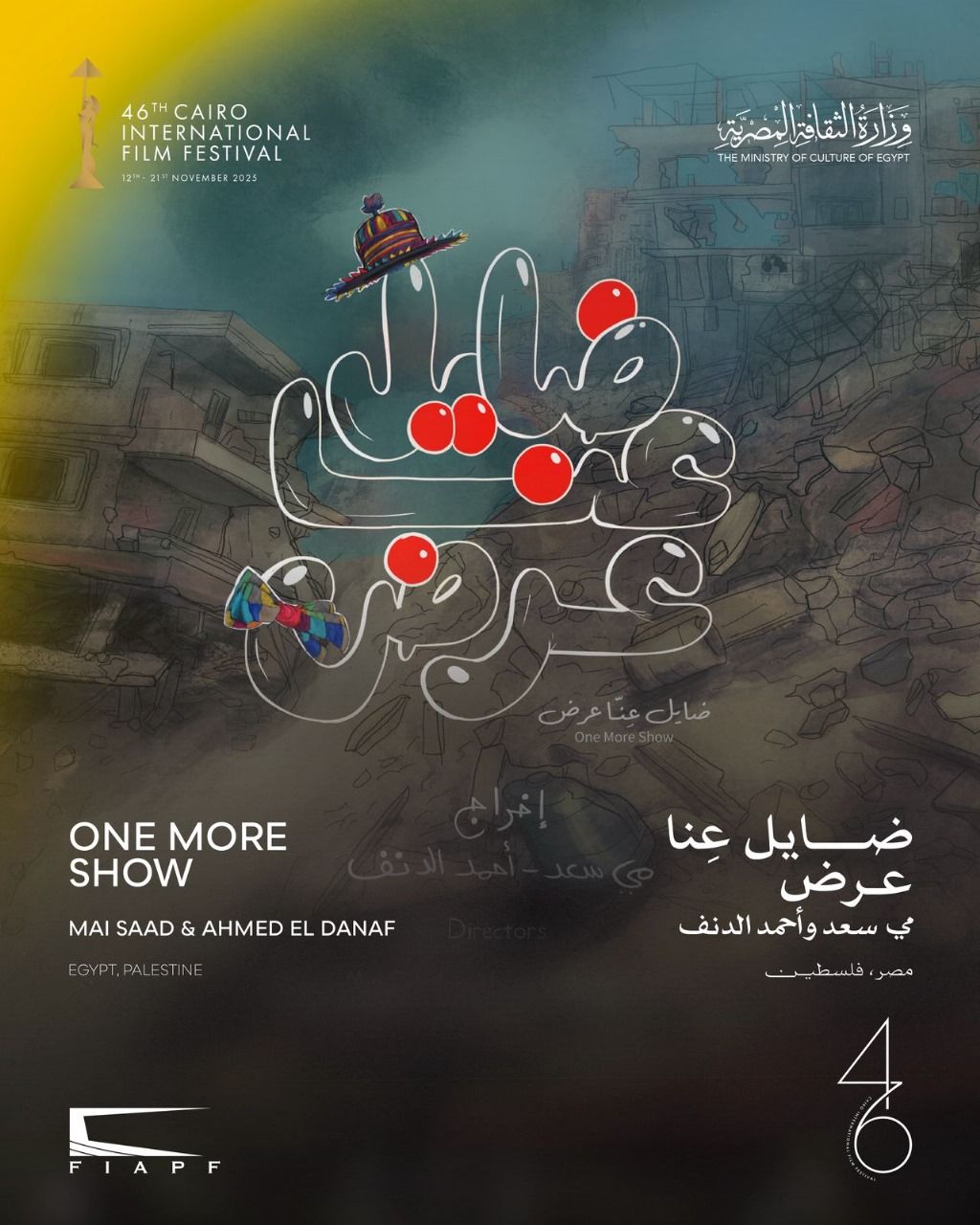 يُعرض اليوم الخميس، ضمن عروض الجالا في مهرجان القاهرة السينمائي الدولي الـ46، الفيلم الوثائقي "ضايل عِنا عرض" (مصر، فلسطين) من إخراج مي سعد وأحمد الدنف، في عرضه العالمي الأول وذلك في تمام الساعة 6:00 مساءً على المسرح الكبير بدار الأوبرا المصرية.