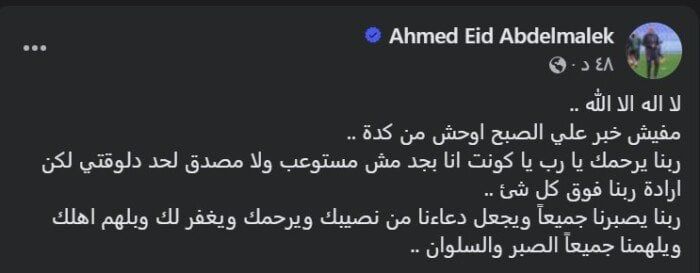 وكتب أحمد عيد عبد الملك منشورًا مؤثًرًا على صفحته الرسمية عبر موقع «فيس بوك»:«لا إله الا الله، مفيش خبر على الصبح اوحش من كدة، ربنا يرحمك يارب، أنا بجد مش مستوعب ولا مصدق لحد دلوقتي لكن إرادة ربنا فوق كل شئ»>