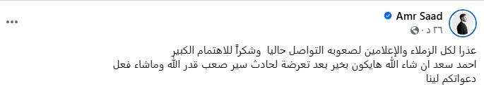 نشر الفنان عمرو سعد، شقيق المطرب أحمد سعد، منشورًا عبر وسائل التواصل الاجتماعي ليطمئن الجمهور والزملاء والإعلاميين بعد تعرض شقيقه لحادث سير صعب. واعتذر عن صعوبة التواصل في الوقت الحالي، شاكرًا الاهتمام الكبير من الجميع.