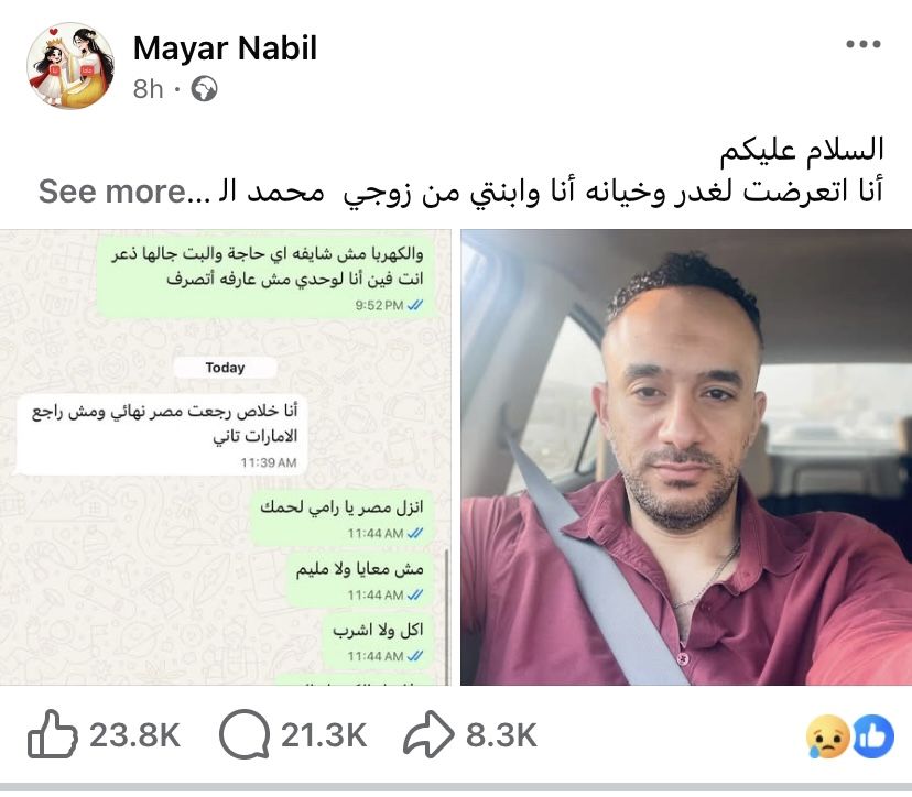 وتقول إنها حاولت الاتصال به دون جدوى قبل أن تتلقى منه رسالة تفيد بأنه عاد إلى مصر، تاركًا إياها وابنتهما دون أي أموال أو وسيلة للحياة في الإمارات.